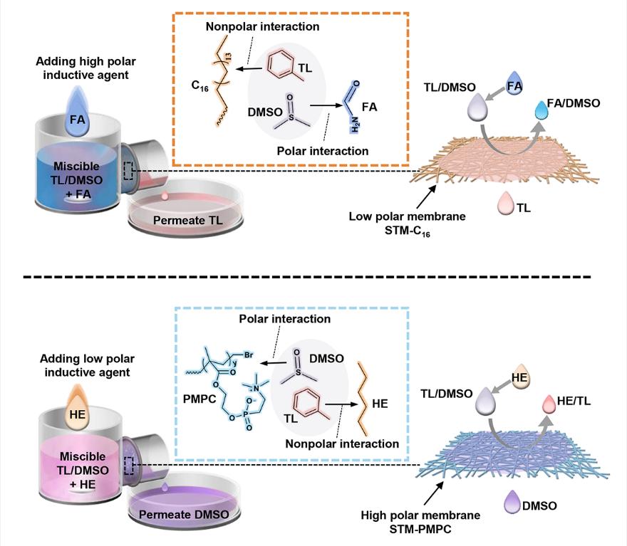 互溶有機(jī)液體小分子(特別是分子量小于100的有機(jī)分子)的高效分離和純化,被認(rèn)為是能改變世界的一類化學(xué)分離過(guò)程,對(duì)石油精煉、精細(xì)化工以及藥物研發(fā)至關(guān)重要。受水處理分離膜的啟發(fā),有機(jī)溶劑反滲透膜、有機(jī)溶劑正滲透膜和有機(jī)溶劑滲透蒸發(fā)膜已經(jīng)成功實(shí)現(xiàn)了互溶有機(jī)液體小分子的分離。但這幾種分離膜存在分離通量低、易污染等缺點(diǎn)。仿生超浸潤(rùn)分離膜可實(shí)現(xiàn)不互溶有機(jī)液體小分子的高效、高通量分離,但對(duì)互溶有機(jī)液體小分子體系束手無(wú)策。針對(duì)這一難題,我校化學(xué)化工學(xué)院劉洪亮教授與中科院理化所的研究人員打破傳統(tǒng)仿生超浸潤(rùn)分離膜只考慮固體多孔膜設(shè)計(jì)的局限,合理引入誘導(dǎo)分相劑,通過(guò)協(xié)同調(diào)控誘導(dǎo)分相劑、固體多孔膜上的功能分子與互溶有機(jī)液體小分子之間在分子層次上的極性/非極性相互作用,發(fā)展了一種全新的仿生超浸潤(rùn)膜分離策略,實(shí)現(xiàn)了互溶有機(jī)液體小分子的高效、高通量分離。該超浸潤(rùn)分離膜的分離通量較傳統(tǒng)的有機(jī)液體膜分離技術(shù)(滲透蒸發(fā)或反滲透)高2-3個(gè)數(shù)量級(jí),極大拓展了仿生超浸潤(rùn)分離膜的應(yīng)用領(lǐng)域。研究成果以“Miscible organic liquid separation of superwetting membrane driven by synergistic polar/nonpolar interactions”為題被國(guó)際權(quán)威化學(xué)期刊Matter(Cell的姊妹刊,IF = 15.589)接受(DOI:10.1016/j.matt.2022.02.011)。化院劉洪亮教授為通訊作者(LeadContact),柳嬋老師參與了部分工作。