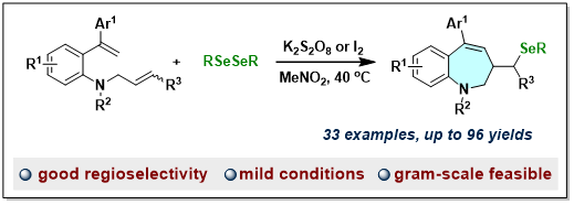 有機(jī)硒化合物,尤其是硒雜環(huán)化合物,因其在醫(yī)學(xué)和材料科學(xué)中具有顯著的應(yīng)用價值而被廣泛研究。目前,已有多種構(gòu)建硒雜環(huán)化合物的方法相繼被探索和報(bào)道。其中,由二硒醚化物促使的環(huán)化反應(yīng)是最具代表性的一種策略。然而,該領(lǐng)域所涉及的反應(yīng)主要集中在構(gòu)建具有5元或6元環(huán)的雜環(huán)產(chǎn)物,而專門用于構(gòu)建7元硒雜環(huán)的方法很少報(bào)道。在僅有的幾例報(bào)道中,主要以芳基-炔烴類結(jié)構(gòu)為底物,反應(yīng)中或需要化學(xué)計(jì)量的金屬氧化劑(FeCl3),或受到二芳基二硒化物的限制(僅有二苯基二硒化物研究),進(jìn)一步影響了反應(yīng)的實(shí)際應(yīng)用。