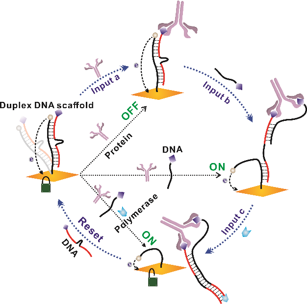 近日,化學(xué)化工學(xué)院劉樹峰教授團(tuán)隊(duì)基于標(biāo)記的雙鏈DNA骨架,設(shè)計(jì)得到了一種簡(jiǎn)便、通用的電化學(xué)傳感分析研究界面,可實(shí)現(xiàn)目標(biāo)蛋白質(zhì)的多種信號(hào)響應(yīng)模式檢測(cè);并可用于目標(biāo)蛋白綁定信息的連續(xù)監(jiān)測(cè)。進(jìn)一步,基于該傳感界面上的串級(jí)“與門”邏輯操作,構(gòu)筑得到了一種可重置、電信號(hào)響應(yīng)的分子鍵盤鎖,進(jìn)行生物分子邏輯運(yùn)算。所構(gòu)筑的傳感分析平臺(tái)具有設(shè)計(jì)及操作簡(jiǎn)單、信號(hào)輸出靈活可控、檢測(cè)靈敏度及選擇性好、以及可擴(kuò)展的邏輯運(yùn)算功能等優(yōu)勢(shì)。