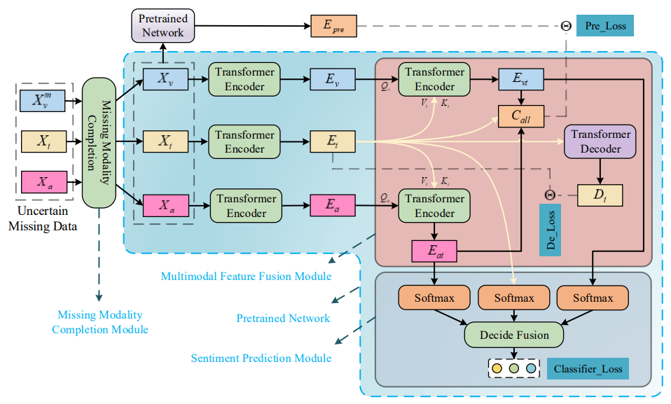 SMCMSA模型構建了全模態樣本數據庫,使用預訓練的單模態情感分析模型對樣本數據進行情感標簽預測,通過設計兩個獨立的相似模態補全策略對缺失模態進行補全。對于補全后的數據,利用Transformer的Encoder模塊對文本、視頻和音頻模態進行編碼,并在預訓練模型指導下進行模態融合,提升表示質量,并運用基于決策級融合策略得到最終的識別結果。目前,該模型的情緒識別準確度處于領先水平。該研究工作得到了國家自然科學基金項目、山東省自然科學基金重點項目、山東省泰山特聘學者項目、澳大利亞研究理事會(ARC)未來獎學金和發現項目的支持。