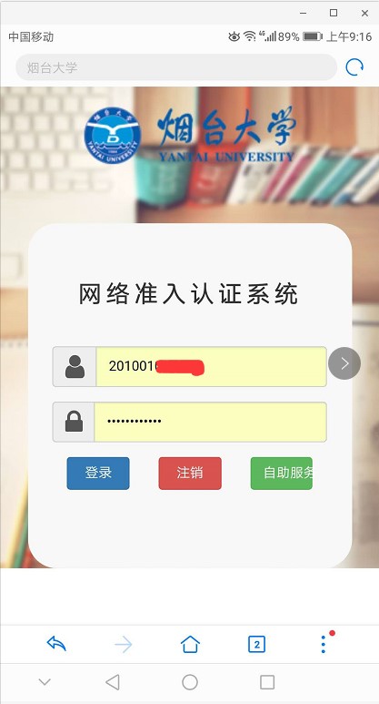 校園無線采用web認證,連接YTU后,打開瀏覽器會自動轉到下圖所示的認證頁面(有的瀏覽器不允許自動轉到認證頁面,這時需要手工在瀏覽器中打開煙臺大學官網http://www.ml2233.xyz,點擊右下角的“計費系統”);