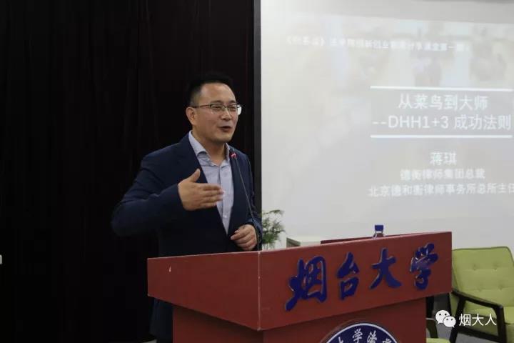 2017年9月28日蔣琪校友做客煙大法學院《創(chuàng)客說》欄目,做了題為《從菜鳥到大師--DHH 1+3成功法則》主題演講。他為大家分享了他個人成長經(jīng)歷以及德和衡律師創(chuàng)業(yè)成功的秘訣。他指出,“1+3”成功法則中,“1”是指目標,每個個體、公司都要有一個清晰的目標,并為它日夜奮斗。“3”是實現(xiàn)目標要做到3點,分別是勤奮、專業(yè)和智慧。成功的“秘訣”在于八小時之外,光鮮的背后都是勤奮在支撐,只有反復、不斷的訓練才能培養(yǎng)熟練的技能。
