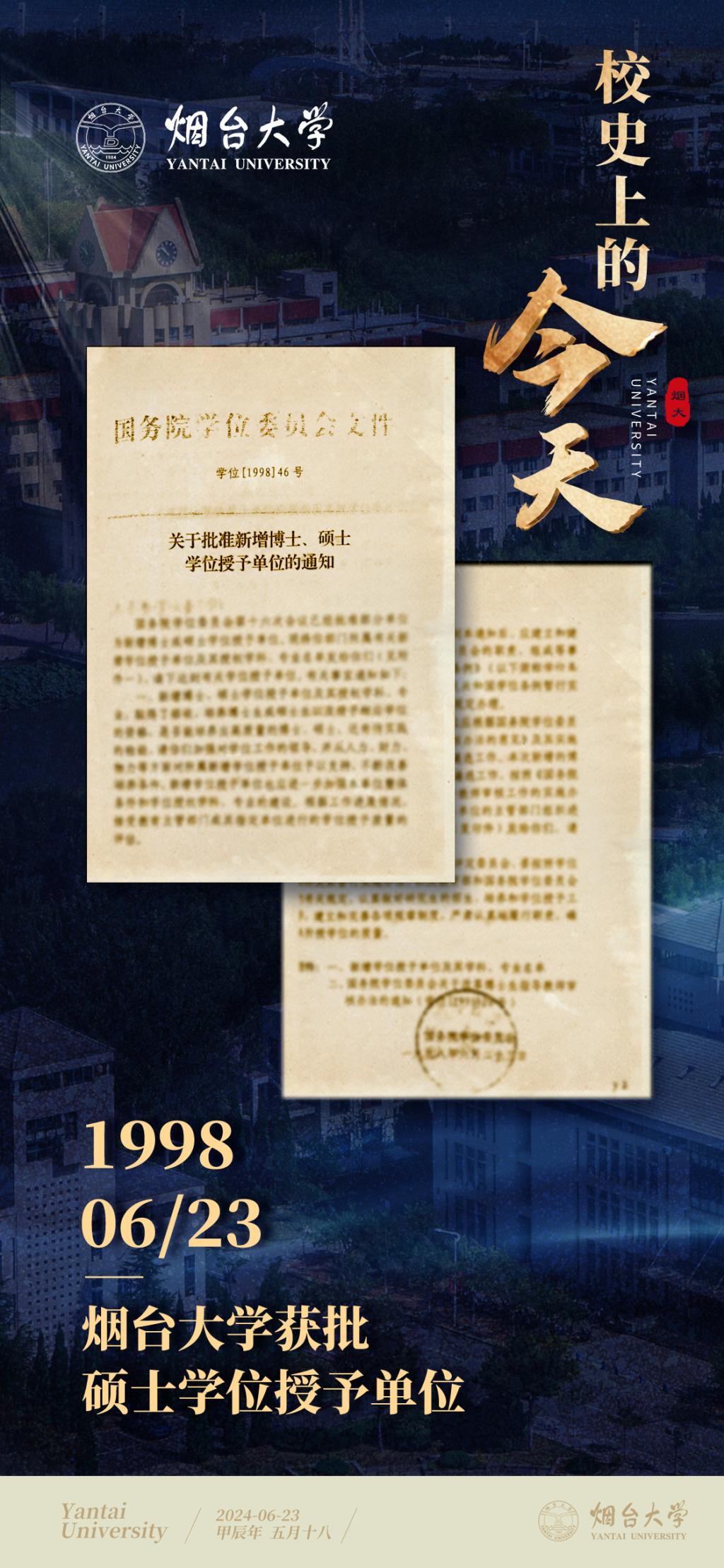 1998年6月23日,國務院學位委員會向山東省學位委員會下發《關于批準新增博士、碩士學位授予單位的通知》。根據《通知》,煙臺大學獲批碩士學位授予單位,民商法學、光學獲批碩士學位授予學科。