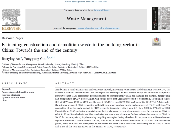 [1] Runying An, Yangyang Guo. Estimating construction and demolition waste in the building sector in China: Towards the end of the century[J]. Waste Management, 2024, 190: 285-295. https://doi.org/10.1016/j.wasman.2024.09.023.